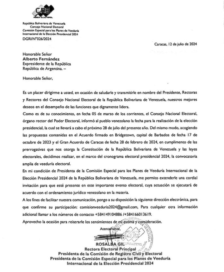 Como puede verse en la nota que se muestra, el Consejo Nacional Electoral de la República Bolivariana de Venezuela me convocó a participar como veedor de la elección que se celebrará en ese país el próximo domingo.En el día de ayer, el gobierno nacional venezolano me transmitió su voluntad de que no viajara y desistiera de cumplir con la tarea que me había sido encomendada por el Consejo Nacional Electoral.La razón que se me dio es que, a juicio de aquel gobierno, declaraciones públicas realizadas por mí ante un medio nacional causaban molestias y generaban dudas sobre mi imparcialidad. Entendieron que la coincidencia con lo que había expresado un día antes el presidente de Brasil, Luiz Inácio Lula da Silva, generaba una suerte de desestabilización del proceso electoral.Debo aclarar que no comprendo tal malestar. Solo dije que en una democracia, cuando el pueblo emite su sufragio, “el que gana, gana y el que pierde, pierde” y si el oficialismo fuera eventualmente derrotado debía aceptar el veredicto popular. Otro tanto debería hacer la oposición en el caso de que el resultado le fuera adverso.Ante la insólita demanda, creí conveniente no viajar y no dar lugar a que se me atribuya querer enturbiar una jornada electoral trascendental, cuando solo buscaba cumplir con la tarea propia de un veedor electoral.Un veedor electoral debe vigilar el cumplimiento de las normas establecidas durante todo el acto electoral, de manera objetiva, imparcial y transparente. Ese era mi único propósito. Hubiera querido poder hacerlo, pero siento que en el contexto creado no podré cumplir cabalmente con esa tarea.Mi mayor deseo es que Venezuela, que en estos años fue asediada por amenazas de invasión y lastimada en su economía por un brutal bloqueo, pueda celebrar sus elecciones de manera transparente y que el veredicto popular sea respetado cualquiera sea el resultado.Si ese objetivo se cumple, el pueblo venezolano recuperará la convivencia democrática y los millones de venezolanas y venezolanos que debieron emigrar podrán regresar a esa maravillosa tierra en la que nacieron.Hago pública esta situación con mucho pesar, pero con el único objetivo de expresar mis mejores deseos de que Venezuela tenga el mejor futuro que merece.