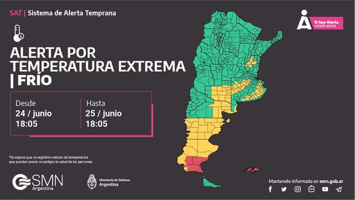 Alerta amarilla por temperaturas extremas, emitido por el Servicio Meteorológico Nacional prevista para el día 25 de junio.La contingencia climática afectará la totalidad de la Provincia de Chubut.Las temperaturas mínimas pueden tener un efecto leve a moderado en la salud.