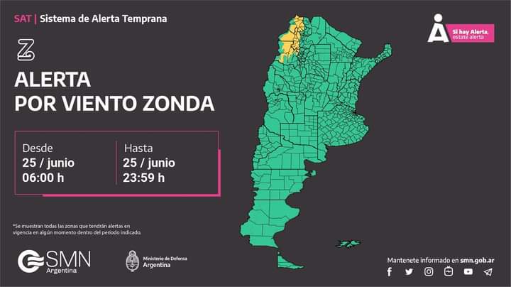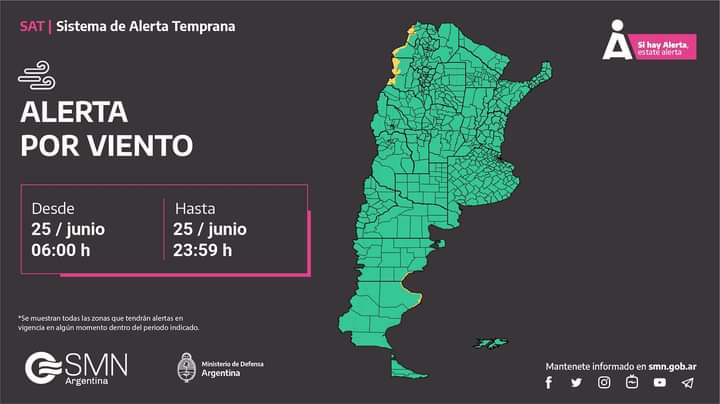 Alerta amarillo por vientos, emitido por el Servicio Meteorológico Nacional prevista para la noche del 25 de junio.La contingencia climática afectará las zonas de: Costa de Escalante.Se esperan vientos del sector oeste, con velocidades entre 45 y 60 km/h y ráfagas que pueden alcanzar los 100 km/h