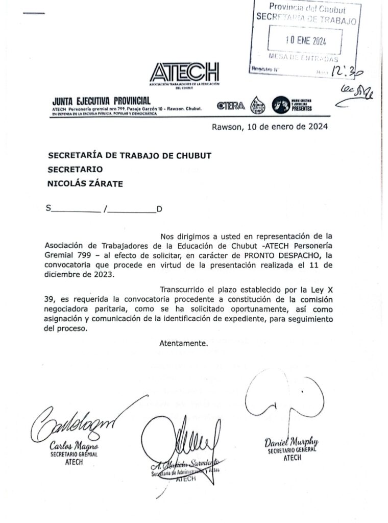 “A efecto de solicitar en carácter de pronto despacho la convocatoria que procede en virtud de la presentación realizada el 11 de diciembre de 2023. Transcurrido el plazo establecido por la Ley X 39, es requerida la convocatoria procedente a constitución de la comisión negociadora paritaria, como se ha solicitado oportunamente, asi como asignación y comunicación de la identificación de expediente, para seguimiento del proceso”.