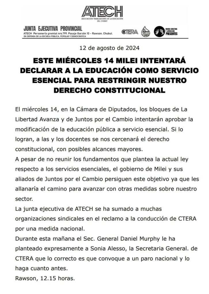 La Asociación de Trabajadores de la Educación de Chubut solicitó a CTRA medidas urgentes ante la posible modificación de la educación pública a escencial, lo que consideran pondrá en peligro los derechos de los docentes.