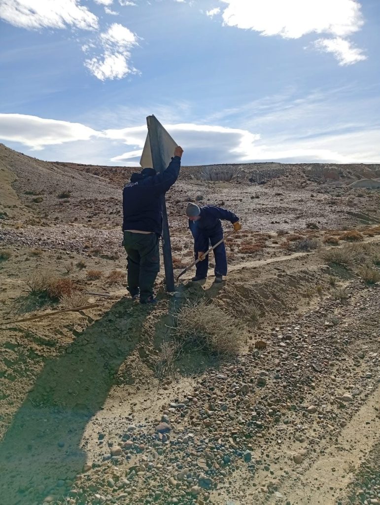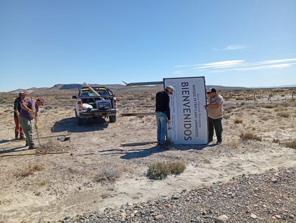 El Ministerio de Turismo y Áreas protegidas del Chubut colocó Nueva cartelería de ingreso al Área Natural Protegida Bosque Petrificado Sarmiento.