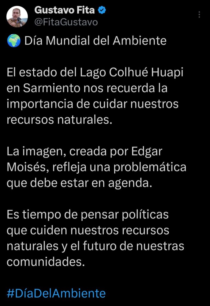 A través de su cuenta oficial de X el Diputado Provincial Gustavo Fita hizo mención al Día Mundial del Ambiente con una imagen del ex Lago Colhue Huapi de Sarmiento, Chubut.