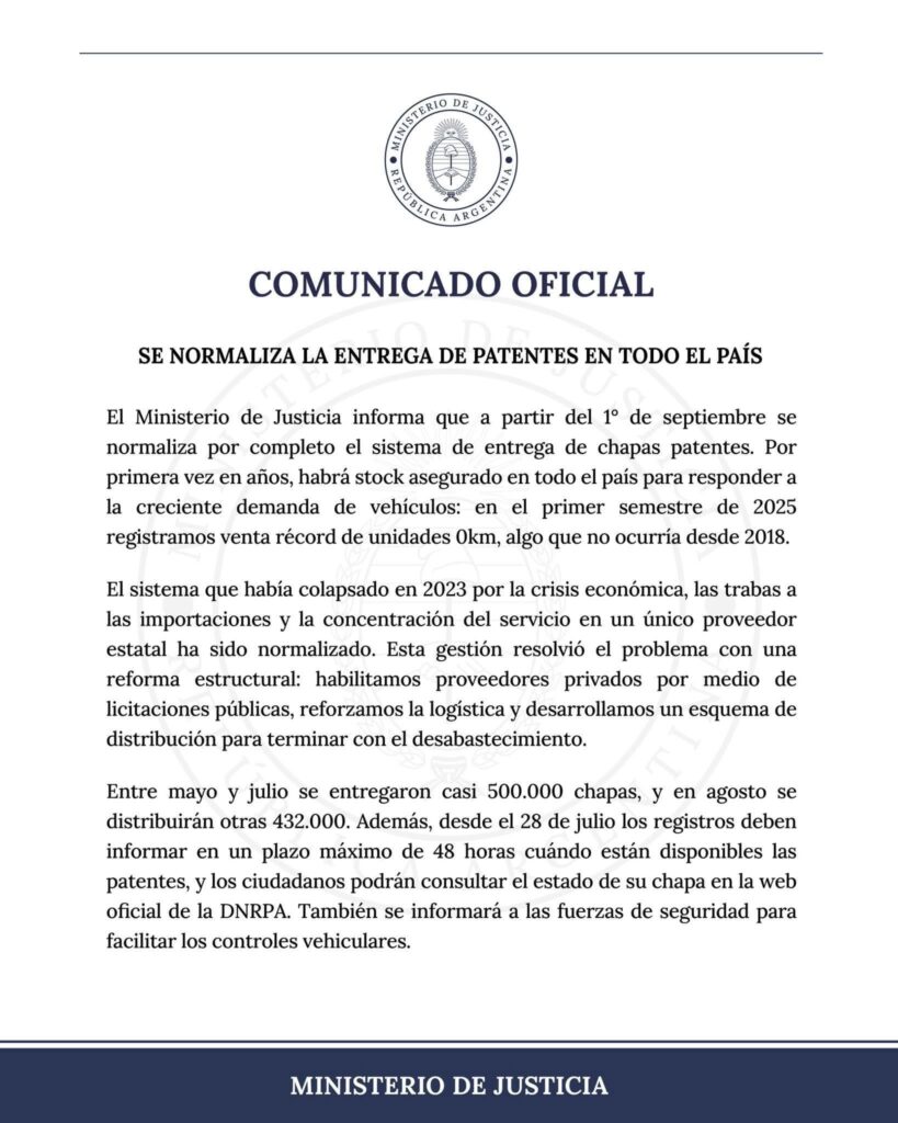 A través de un comunicado difundido en sus redes sociales, el Gobierno Nacional confirmó que a partir del 1° de septiembre se normalizará la entrega de patentes en todo el territorio argentino.