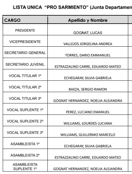 LISTA única “PRO CHUBUT (Consejo Directivo) LISTA única “PRO RAWSON (Junta Departamental) LISTA única “PRO ESCALANTE” (Junta Departamental) LISTA única “PRO BIEDMA” (Junta Departamental) LISTA única “PRO FUTALEUFU (Junta Departamental) única “PRO SARMIENTO” (Junta Departamental)LISTA única “PRO GAIMAN” (Junta Departamental) para la cobertura de los cargos incluidos en el llamado;