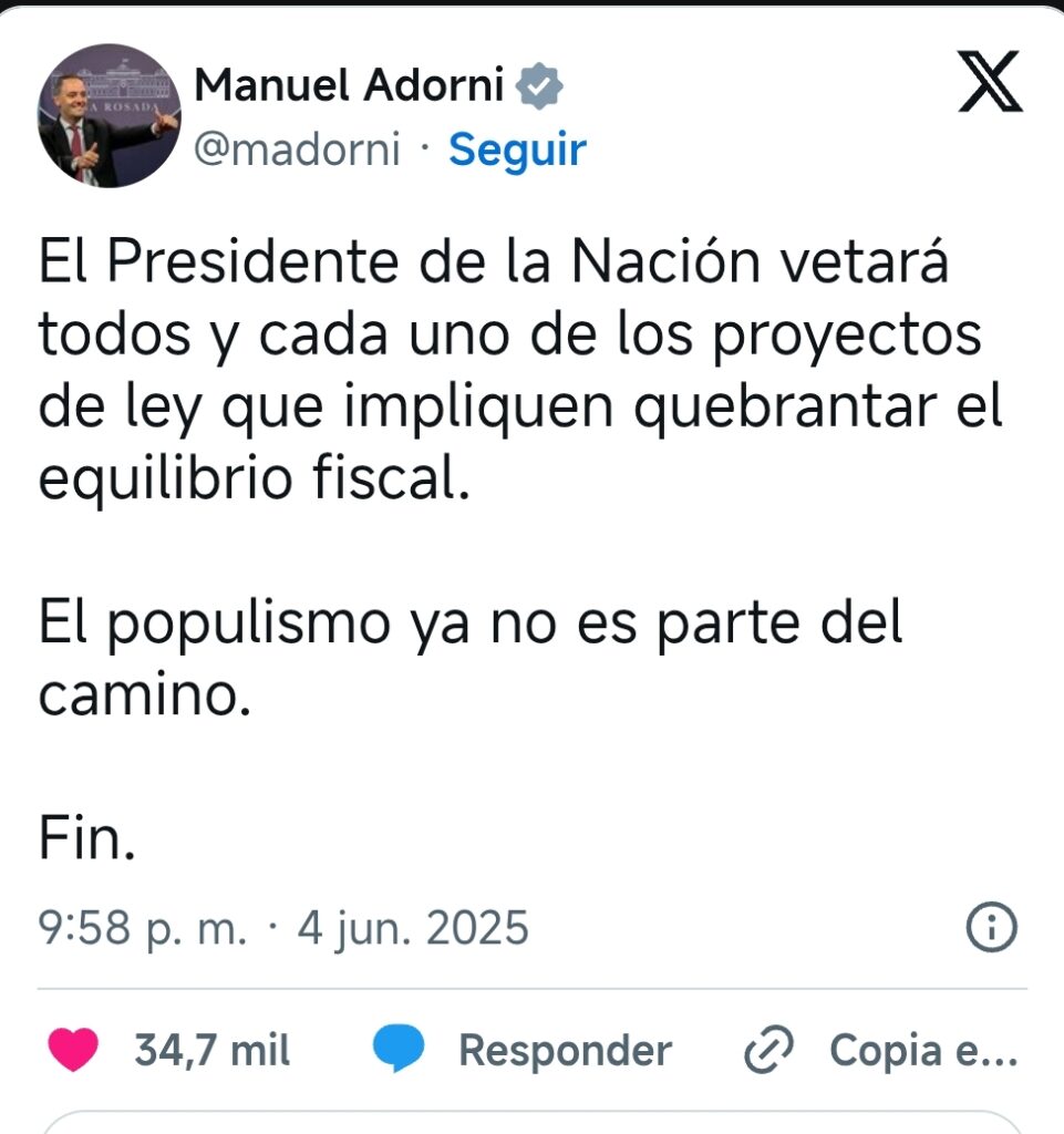 “El Presidente de la Nación vetará todos y cada uno de los proyectos de ley que impliquen quebrantar el equilibrio fiscal”. señaló a través de un mensaje publicado en su cuenta de X.”El populismo ya no es parte del camino. Fin”, concluyó el portavoz confirmando lo anticipado por el jefe de Gabinete, Guillermo Francos.