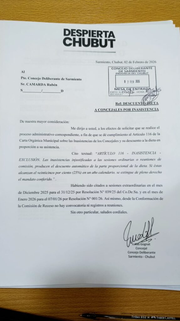 El pedido se presentó formalmente este lunes, para solicitar que se realice el proceso administrativo correspondiente, a fin de que se dé cumplimiento al Artículo 116 de la Carta Orgánica Municipal sobre las Inasistencias de los Concejales y su descuento a la dieta en proporción a su asistencia.