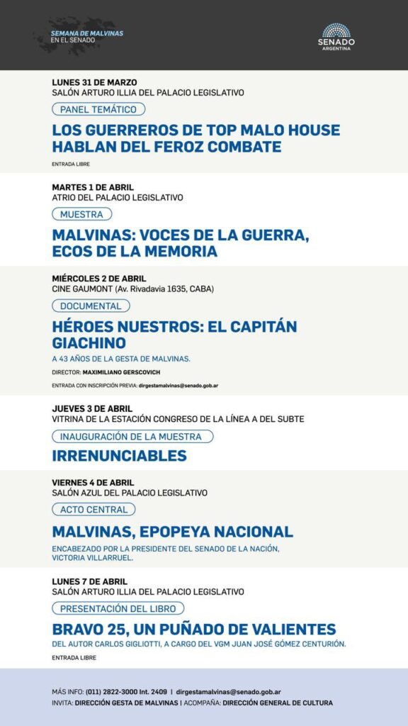 “¡Malvinas Argentinas hoy y siempre! En el Senado de la Nación nos honra invitarlos a las actividades que haremos durante toda la semana para recordar la Gesta de Malvinas, recordar a nuestros héroes y acompañar y abrazar a los Veteranos”, expresó.