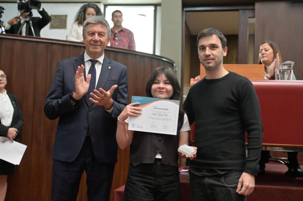 La alumna Jazmin Alonso de Escuela 739 de Sarmiento fue reconocida este jueves en la sesión especial encabezada por el Presidente de la cámara Gustavo Menna y que contó con la presencia del Gobernador de Chubut Ignacio Torres, el Ministro de Educación José Luis Punta, funcionarios del Poder Ejecutivo, el equipo de la dirección de becas y políticas compensatorias del ministerio de Educación y familiares de los estudiantes reconocidos.