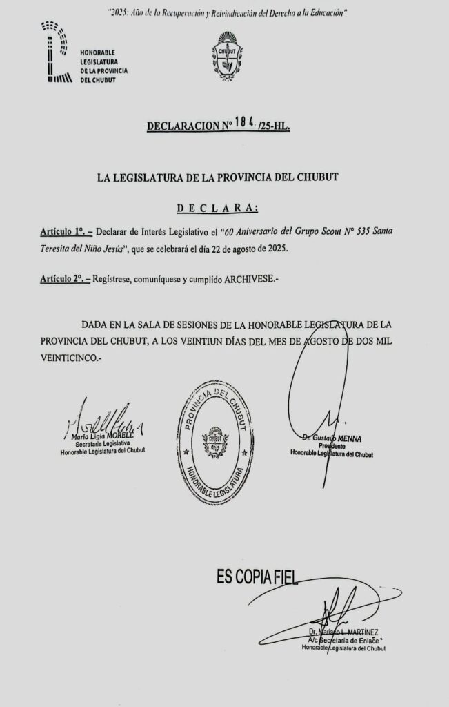 Los legisladores tuvieron en consideración la trayectoria del Grupo Scout N° 535 Santa Teresita del Niño Jesús, el cual fue fundado el 22 de agosto de 1965 por el Padre Juan Bautista Pettiti.