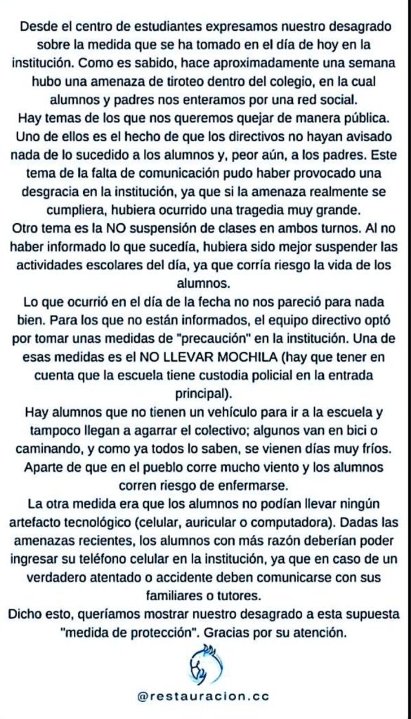 El Centro Estudiantil de la Escuela 739 de Sarmiento se expresó con un comunicado en las redes sociales sobre su postura por todo lo que ocurre en el colegio. ” Hubiera sido mejor suspender las actividades escolares del día, ya que corría riesgo la vida de los alumnos”, expresaron.