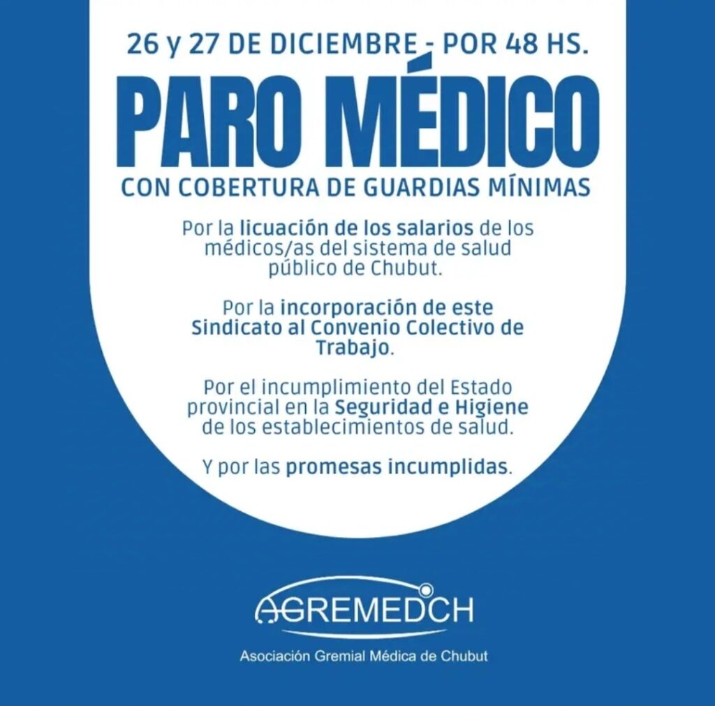 Según indicaron, en el comunicado desde el gremio piden “licuación de los salarios de los médicos/as del sistema de salud público de Chubut, la incorporación del sindicato al convenio colectivo de trabajo y por el incumplimiento del Estado Provincial en la seguridad e higiene de los establecimientos de salud”.