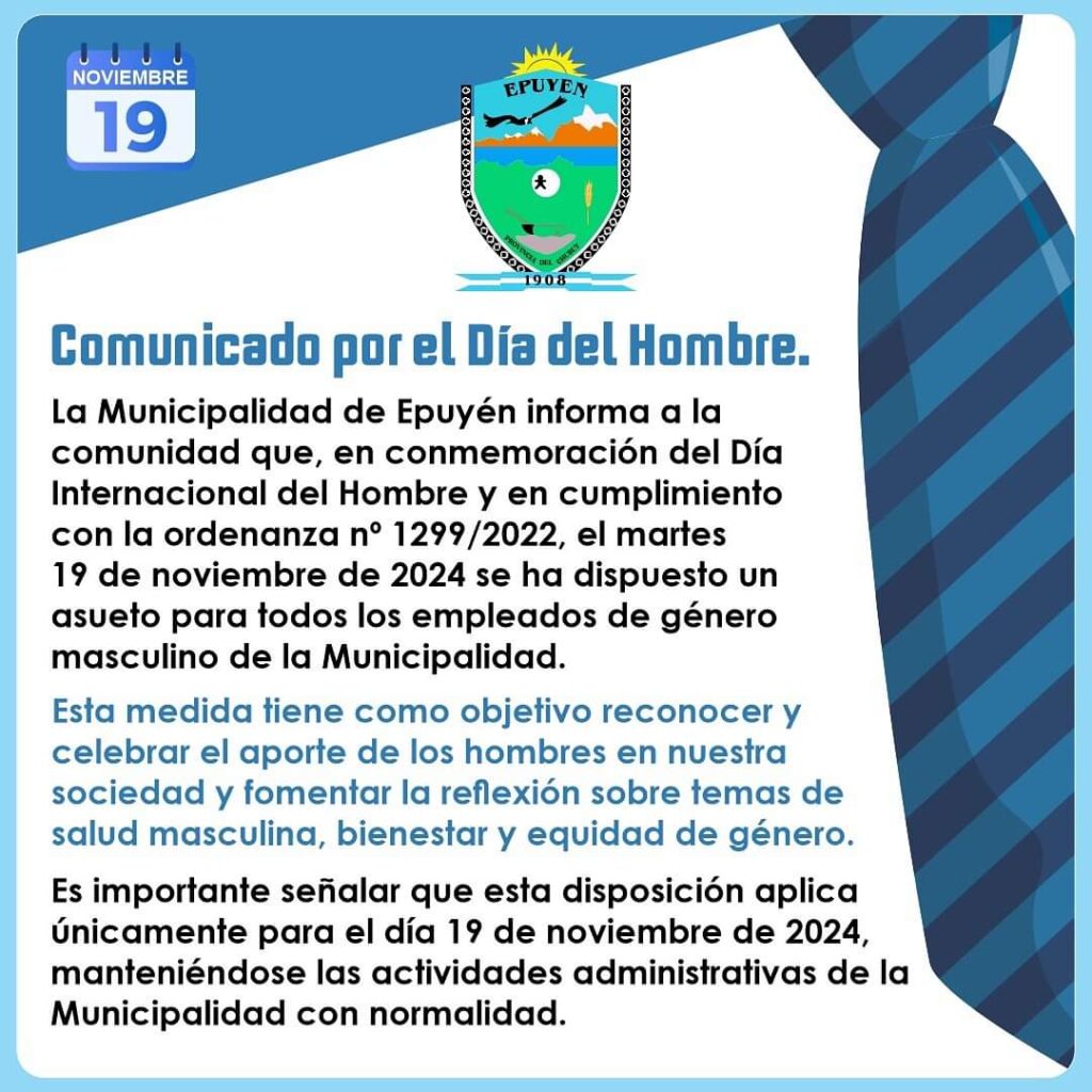 Se trata de la La Municipalidad de Epuyén. Las autoridades comunicaron por medio de un comunicado sobre el asueto para todos los hombres que trabajen en ese Municipio.