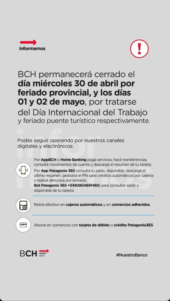 El Banco del Chubut informó que permanecerá cerrado el día miércoles 30 de abril por feriado provincial, y los días O1 y 02 de mayo, por tratarse del Día Internacional del Trabajo y feriado puente turístico respectivamente.