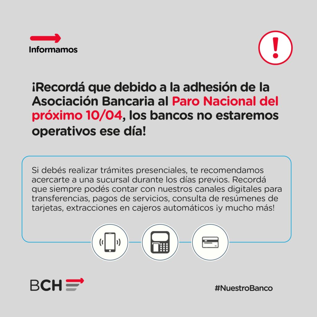 Desde el Banco del Chubut recuerda que debido a la adhesión de la Asociación Bancaria al Paro Nacional del próximo 10/04, los bancos no estarán operativos ese dia.