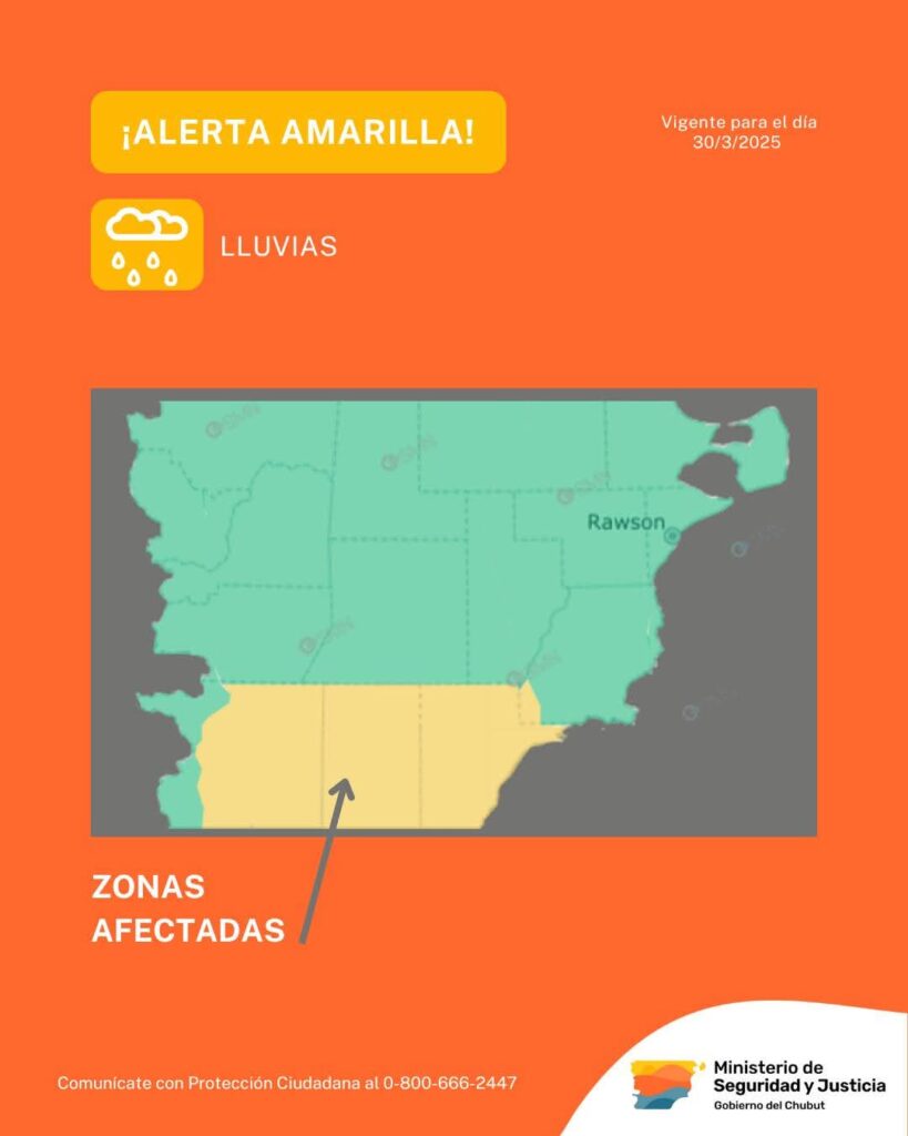 La Subsecretaría de Protección Ciudadana dependiente del Ministerio de Seguridad y Justicia, informa sobre la actualización de zona de cobertura del alerta amarillo por lluvias, emitido por el Servicio Meteorológico Nacional prevista para la madrugada – mediodía del día 30 de marzo.