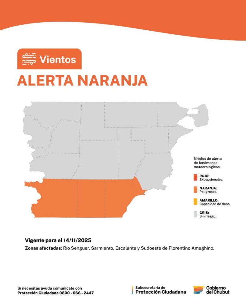 La Subsecretaría de Protección Ciudadana, dependiente del Ministerio de Seguridad y Justicia, informa sobre la zona de cobertura del alerta naranja por vientos, emitido por el Servicio Meteorológico Nacional prevista para la madrugada del viernes 14 de noviembre.