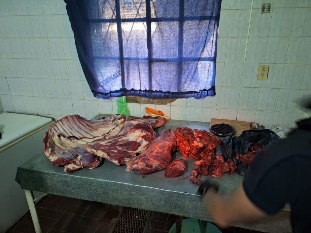 Por el hecho fueron identificadas dos personas y se secuestraron 300 kilos de carne, cuchillos, sierras, balanza, libretas y teléfonos celulares.