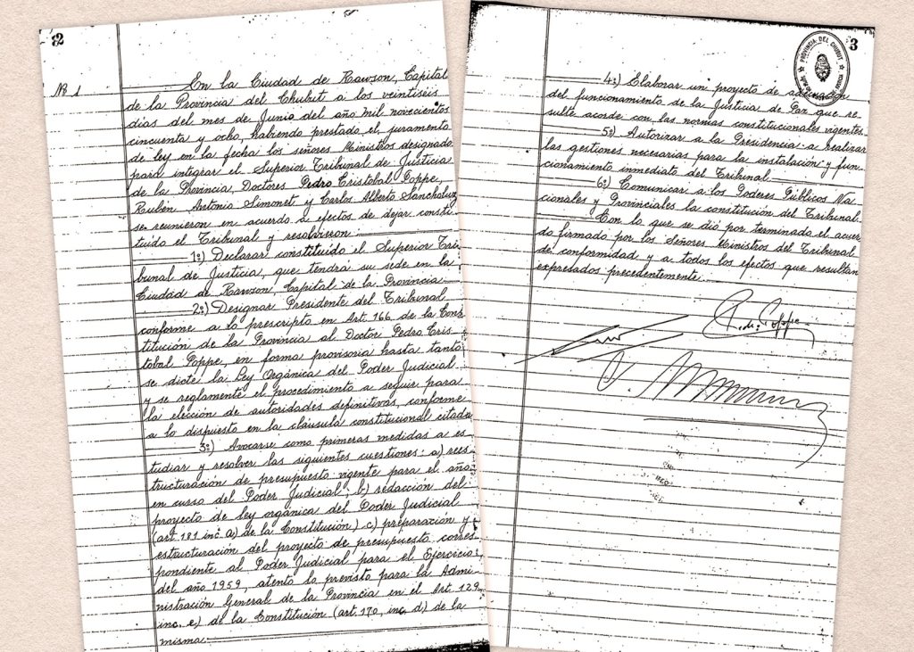 En ese mismo acto “resolvieron declarar constituido el Superior Tribunal de Justicia, que tendrá sede en la ciudad de Rawson, Capital de la Provincia” y en el primer artículo designaron presidente del tribunal” conforme lo prescripto en el art. 166 de la Constitución de la Provincia al Doctor Pedro Cristóbal Poppe, en forma provisoria hasta tanto se dicte la Ley Orgánica del Poder Judicial”.