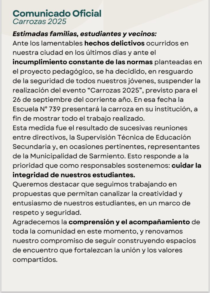 Estimadas familias, estudiantes y vecinos: Ante los lamentables hechos delictivos ocurridos en nuestra ciudad en los últimos dias y ante el incumplimiento constante de las normas planteadas en el proyecto pedagógico, se ha decidido, en resguardo de la seguridad de todos nuestros jóvenes, suspender la realización del evento “Carrozas 2025”, previsto para el 26 de septiembre del corriente año. En esa fecha la Escuela N° 739 presentará la carroza en su institución, a fin de mostrar todo el trabajo realizado. Esta medida fue el resultado de sucesias reuniones entre directivos, la Supervisión Técnica de Educación Secundaria y, en ocasiones pertinentes, representantes de la Municipalidad de Sarmiento. Esto responde a la prioridad que como responsables sostenemos: cuidar la integridad de nuestros estudiantes. Queremos destacar que seguimos trabajando en propuestas que permitan canalizar la creatividad y entusiasmo de nuestros estudiantes, en un marco de respetoy seguridad. Agradecemos la comprensión y el acompañamiento de toda la comunidad en este momento, y renovamos nuestro compromiso de seguir construyendo espacios de encuentro que fortalezcan la unión y los valores compartidos.