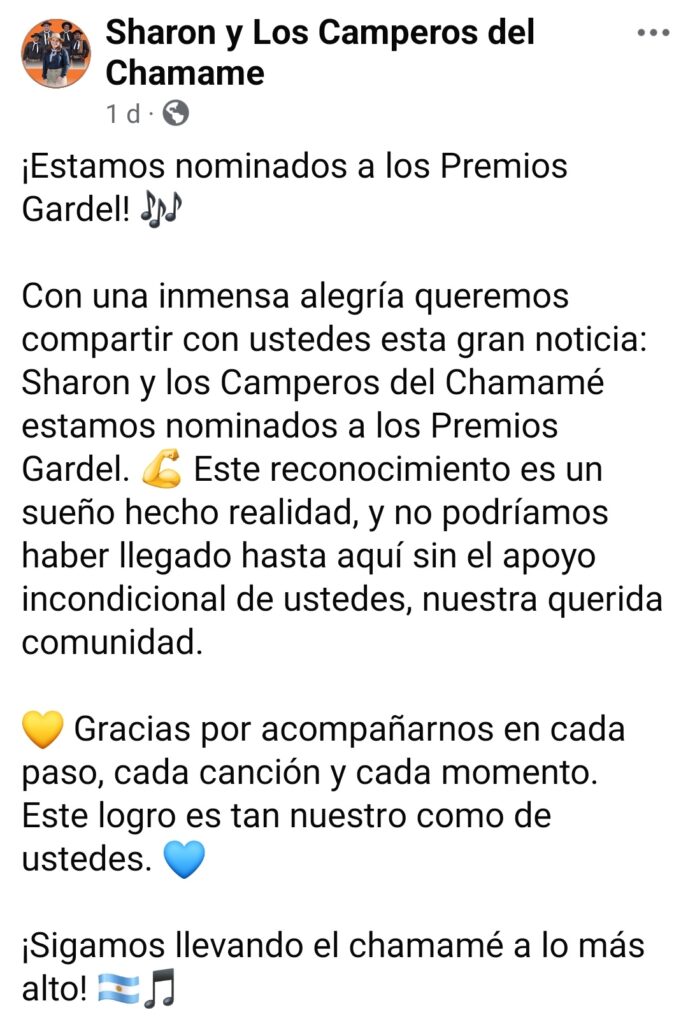 “Estamos nominados a los Premios Gardel!” Compartieron Sharon y Los Camperos del Chamamé en sus redes sociales. La noticia fue compartida por los miles de seguidores que celebraron la nominación a uno de los más importantes premios de la música argentina.