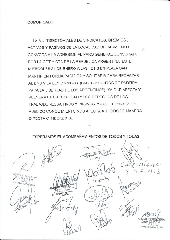 LA MULTISECTORIALES DE SINDICATOS, GREMIOS ACTIVOSY PASIVOS DE LA LOCALIDAD DE SARMIENTO cONVOCA A LA ADHESION AL PARO GENERAL CONVOCADO POR LA cGT Y CTA DE LA REPUBLICA ARGENTINA ESTE MIERCOLES 24 DE ENERO A LAS 12 HS EN PLAZA SAN MARTIN EN FORMA PACIFICA Y SOLIDARIA PARA RECHAZAR AL DNU Y LA LEY OMNIBUS (BASES Y PUNTOS DE PARTIDA PARA LA LIBERTAD DE LOS ARGENTINOS), YA QUE AFECTA Y VULNERA LA ESTABALIDAD Y LOS DERECHOS DE LOS TRABAJDORES ACTIVOS Y PASIVOS, YA QUE COMO ES DE PUBLICo CONOCIMIENTO NOS AFECTA A TODOS DE MANERA DIRECTA O INDERECTA. ESPERAMOS EL ACOMPAÑAMIENTOS DE TODOS Y TODAS