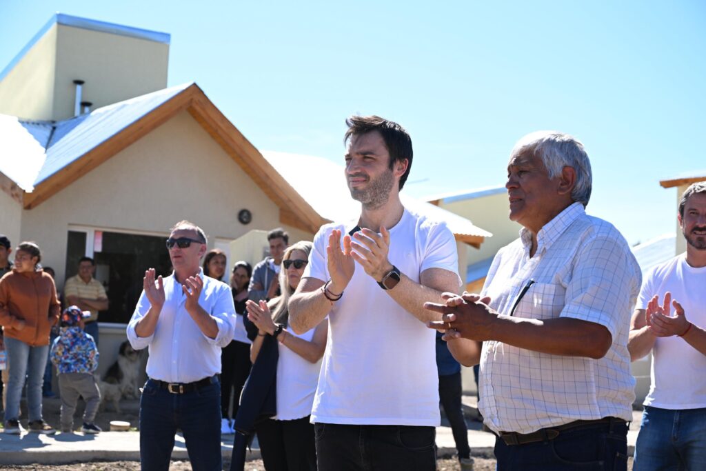 La entrega encabezada por el Gobernador se enmarcó en el proyecto para la construcción de 12 viviendas en planta baja de dos dormitorios, obras complementarias e infraestructura, en la localidad de El Maitén.