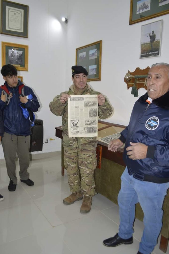 Durante el recorrido organizado para los jóvenes en la Guarnición Ejercito Sarmiento, los integrantes del Centro de Veteranos de Guerra Colonia Sarmiento recordaron y expusieron sus vivencias en el suelo malvinense en la guerra del año 1982.