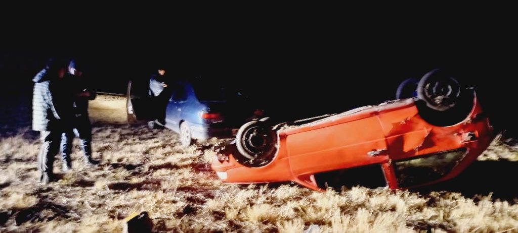 Personal policial de Sarmiento tomó intervención en el sitio mencionado donde se observa sobre banquina norte de la rotonda a un rodado marca VW Gol volcado y con daños de consideración en su carrocería con signos evidentes de haber volcado.